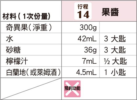 象印食譜»製麵包機食譜»甜點»果醬»奇異果淋醬 製麵包機食譜 奇異果淋醬 奇異果酸味顯著的醬汁。 加入白蘭地搖身變為成熟風味。 作法 奇異果去除皮切成2~3mm厚的扇形,充分壓碎。 將材料依材料表由上而下的順序放入麵包容器。 以「行程」鍵選擇行程編號「14」,再按下「開始」鍵。 《 回列表頁 上一道 下一道