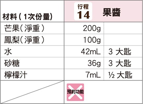 象印食譜»製麵包機食譜»甜點»果醬»熱帶水果淋醬 製麵包機食譜 熱帶水果淋醬 芒果的濃郁甜味和鳳梨的清爽感最相配, 來自南國水果製成的醬汁。 作法 芒果去除皮和種籽,切成1~2cm小塊 並充分壓碎。鳳梨去除皮和芯,切成約5mm小塊。 將材料依材料表由上而下的順序放入麵包容器。 以「行程」鍵選擇行程編號「14」,再按下「開始」鍵。 《 回列表頁 上一道