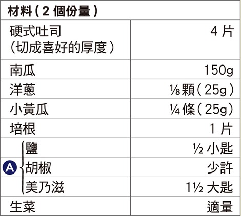 象印食譜»製麵包機食譜»其他»特製菜單»南瓜沙拉三明治 製麵包機食譜 南瓜沙拉三明治 大量使用南瓜,口味濃郁的三明治。 作法 吐司切成喜好的厚度。 南瓜去皮後切成約1cm厚,放在耐熱容器並加1大匙水(份量外),蓋 上保鮮膜以微波爐(500W)加熱3~4分鐘。 趁熱利用搗泥器等將2充分壓碎後,冷卻至常温備用。 小黃瓜和洋蔥切末,洋蔥過水後瀝乾水分。 培根切成約1cm寬,在平底鍋炒至香脆。 將3~5的材料和 A 混合,充分拌勻後分成2等份。 在吐司上塗抹6並放上生菜,再蓋上吐司後切成容易食用的大小。 《 回列表頁 上一道 下一道