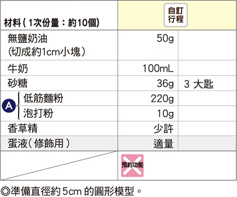 將修飾用蛋液以外的材料,依材料表由上而下的順序放入麵包容器。