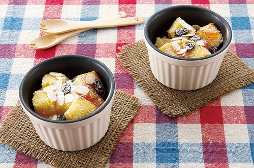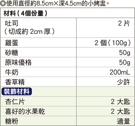 象印食譜»製麵包機食譜»其他»特製菜單»麵包布丁 製麵包機食譜 麵包布丁 趁熱吃絕對美味,放入冰箱冷藏後享用也別具風味,一年四季皆適宜。 請依喜好試著變化吐司或加入其他裝飾的材料吧! 作法 吐司切成約2cm厚片之後,再切成約2cm的小塊。 用打蛋器將雞蛋、砂糖充分攪拌混合,砂糖溶化後加 入原味優格攪拌。 在2中加入牛奶、香草精攪拌混合。 將1放入3裡面,浸泡約10分鐘。 將4分成4等份,分別放入塗有奶油(份量外)的小烤盅。 使用杏仁片、喜好的水果乾分別裝飾。 放入已預熱至約170℃的烤箱中烘烤20~30分鐘。 冷卻後撒上糖粉裝飾。 《 回列表頁 上一道 下一道