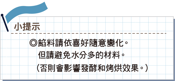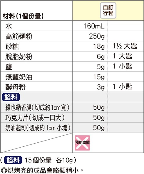 將餡料以外的材料,依材料表由上而下的順序放入麵包容器。