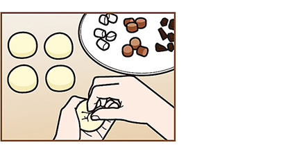 將5擀成圓形並放上4,由周圍將麵團包起,收口處確實捏緊。