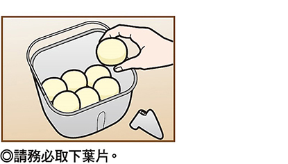 取下麵包容器內的葉片,將6的麵團 隨意地放入麵包容器,再度按下「開 始」鍵。