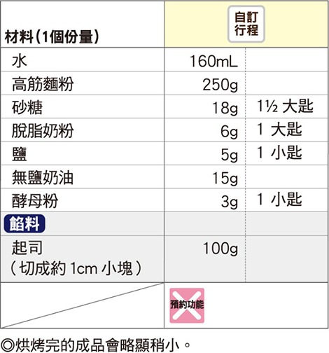 將餡料以外的材料,依材料表由上而下的順序放入麵包容器。