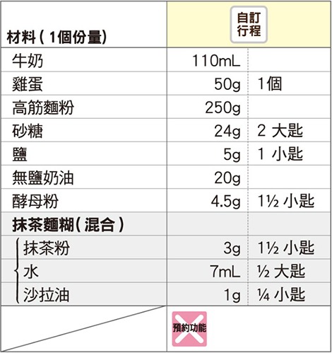 將抹茶麵糊以外的材料,依材料表由上而下的順序放入麵包容器。