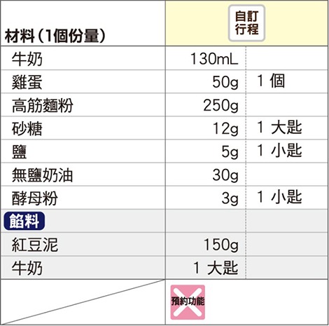 將餡料以外的材料,依材料表由上而下的順序放入麵包容器。
