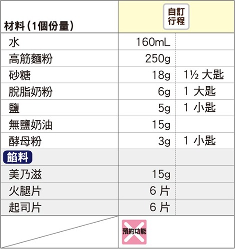 將餡料以外的材料,依材料表由上而下的順序放入麵包容器。