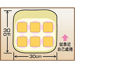 用擀麵棍將麵團擀成30×30cm的正方形,靠近自己的¾部份塗上美乃滋,再依序放上火腿和起司。