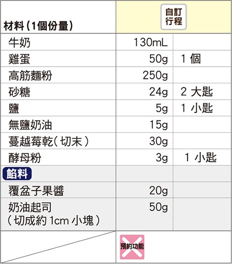 將餡料以外的材料,依材料表由上而下的順序放入麵包容器。