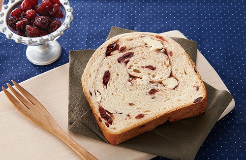 在揉入蔓越莓的麵團上塗上覆盆子果醬,再加上奶油起司烘烤而成。 酸味和甜味十分對味的奢華麵包。