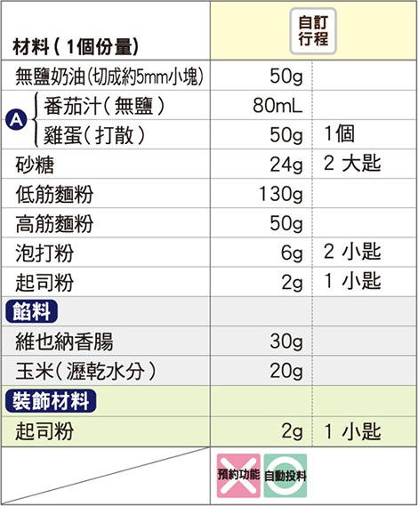 將餡料和裝飾材料以外的材料,依材料表由上而下的順序放入麵包容器。