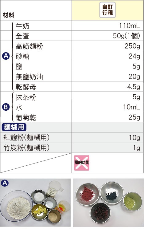 | 將紅麴粉和葡萄乾麵團取出,放入次大麵團和抺茶糊 | 揉麵1 | 總計 |