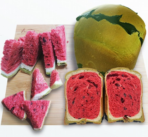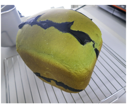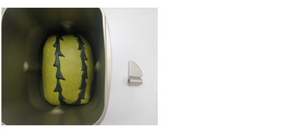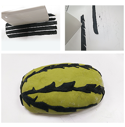 西瓜皮紋路製作方式:黑色麵團擀成長條狀,用刮板分割成數條細長狀,再切割小紋路黏貼在麵團外圍即可。