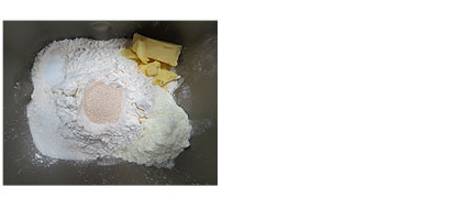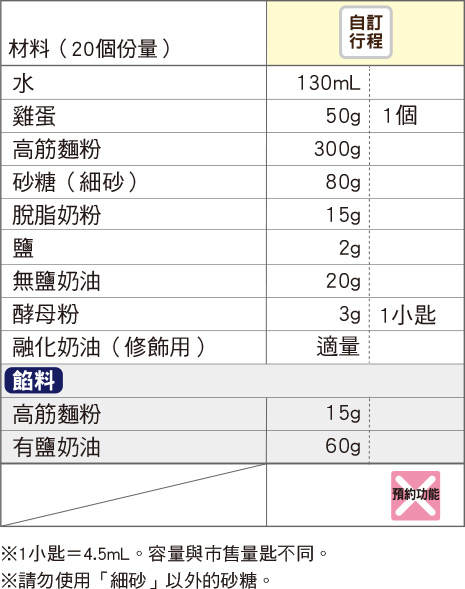 將融化奶油(修飾用)及餡料以外的材料,依材料表由上而下的順序放入麵包容器。