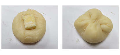 將5的麵團分別在中央放入4,並由周圍將麵團拉至中央收口處確實捏緊滾圓。