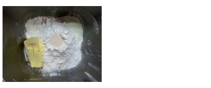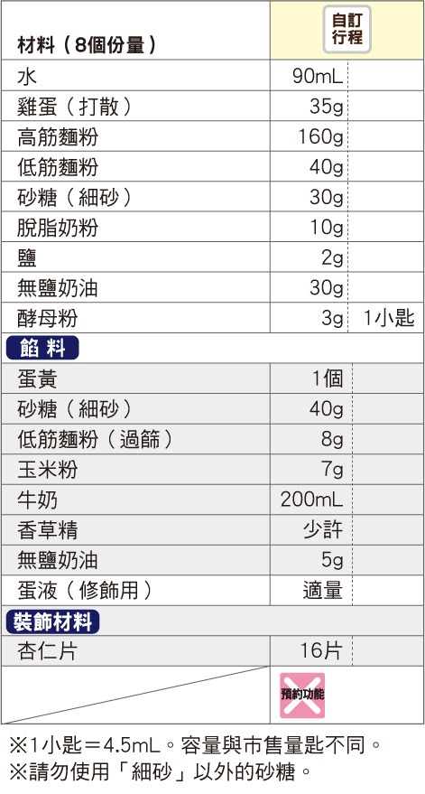 將餡料、蛋液(修飾用)及裝飾材料以外的材料,依材料表由上而下的順序放入麵包容器。