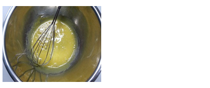 在耐熱容器中倒入蛋黃和砂糖(細砂)用打蛋器攪勻。