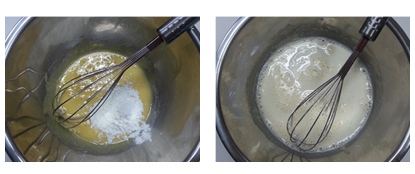 再倒入低筋麵粉和玉米粉攪勻,接著分次逐漸加入牛奶並攪拌後,使用濾網過濾。
