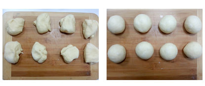 完成的音樂旋律響起後,按下「取消」鍵,從麵包容器取出麵團分成8等份揉圓,蓋上布巾靜置約15分鐘。