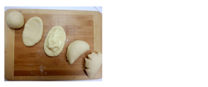 再用擀麵棍擀平成長度約13cm的橢圓形。包入7收口處確實捏緊成半月形。