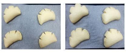收口處切三刀,排列在舖有烘焙紙的烤盤上,噴撒少許水後,以約35℃發酵40~50分鐘。