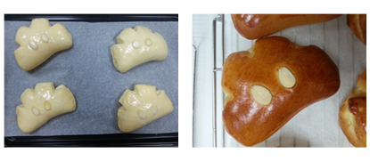 塗刷修飾用的蛋液在麵團表面,並分別放上2片杏仁片,放入已預熱至約190℃的烤箱中烘烤13~15分鐘。