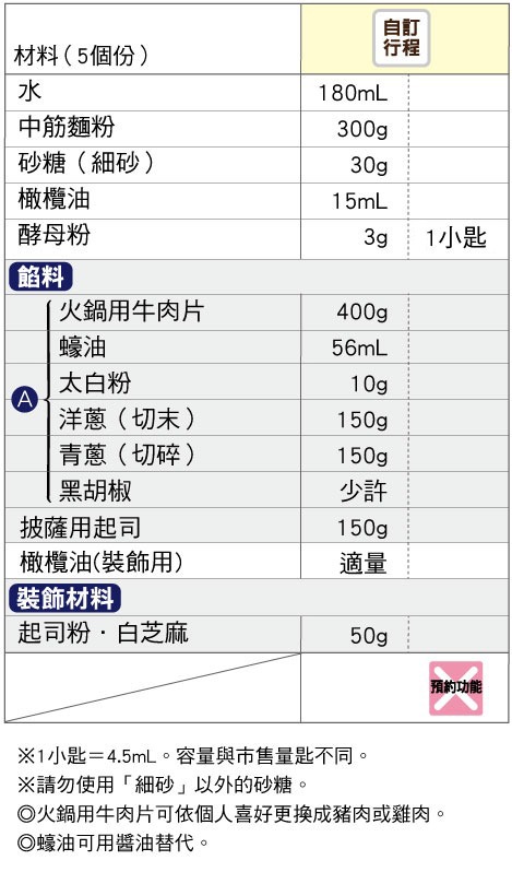 將餡料、橄欖油(修飾用)及裝飾材料以外的材料,依材料表由上而下的順序放入麵包容器。