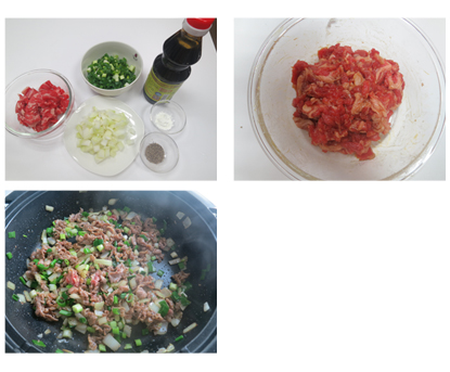肉片用蠔油醃製,拌上些許太白粉備用。接著將洋蔥放入鍋中以中火爆香,再將醃好的肉片放入一起拌炒。起鍋前加入青蔥和黑胡椒,熄火放涼備用。
