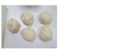 完成的音樂旋律響起後,按下「取消」鍵,從麵包容器取出麵團分成5等份。