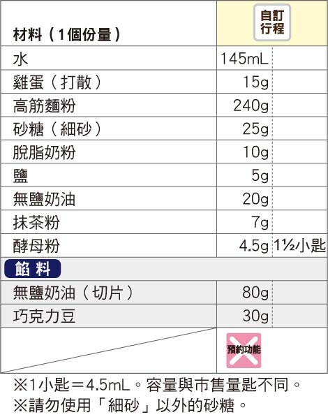 將餡料以外的材料,依材料表由上而下的順序放入麵包容器。