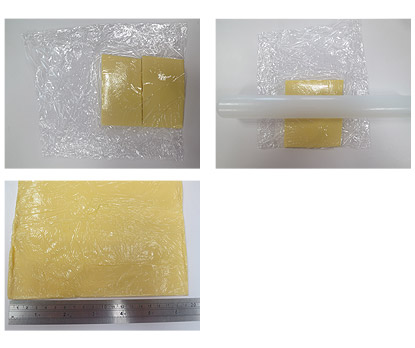 完成的音樂旋律響起後,按下「取消」鍵,從麵包容器取出麵團放入比24x24cm大的透明保鮮袋,再用擀麵棍擀平成約24x24cm的正方形,放入冰箱冷凍約30分鐘。(約1cm厚)