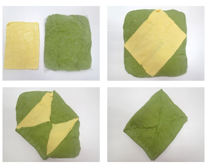 4的麵團冰至稍硬後取出,3交叉菱形放置在麵團上,將麵團四角自奶油四邊折入包覆。