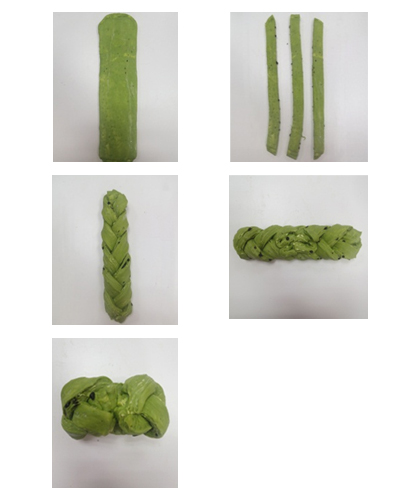 以擀麵棍將麵團擀平成約35x10cm的長方形,縱切成3條(約3cm寬),交叉編成麻花辮子狀後,兩端往中央對折。