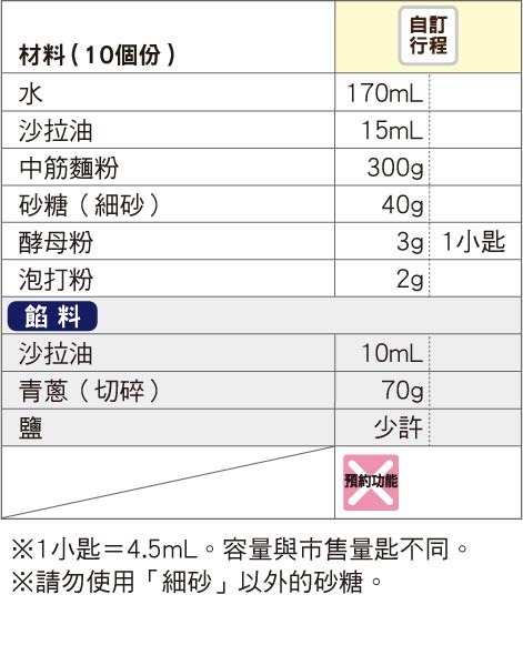 將餡料以外的材料,依材料表由上而下的順序放入麵包容器。
