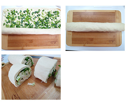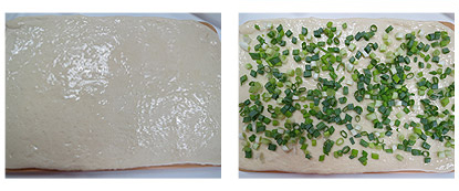 將4在靠近自己的3/4部分塗上餡料的沙拉油,之後均勻撒上青蔥(切碎)及鹽。