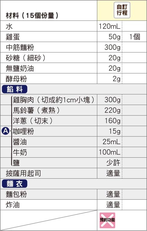將餡料、麵衣及炸油以外的材料,依材料表由上而下的順序放入麵包容器。