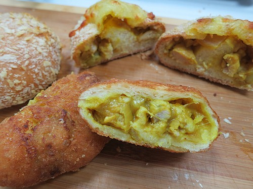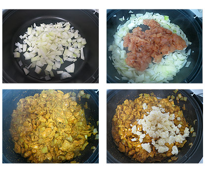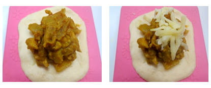 將洋蔥放入鍋中以中火爆香後,放入雞胸肉炒散。接著加入咖哩粉及醬油炒香後,加入牛奶及鹽攪拌煮開。最後加入3,立即熄火,充分攪勻放涼備用。