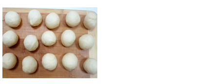完成的音樂旋律響起後,按下「取消」鍵,從麵包容器取出麵團分成15等份揉圓。