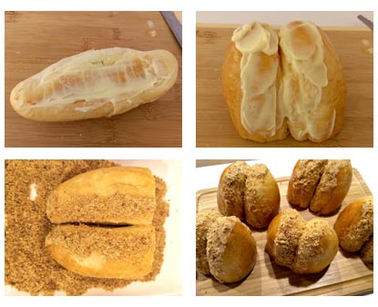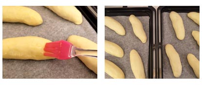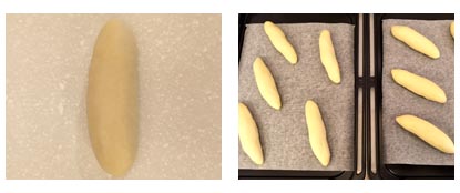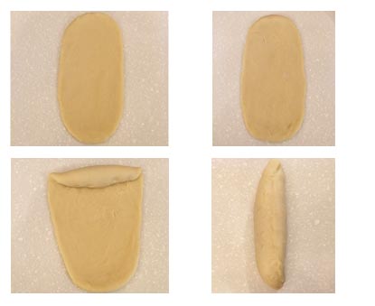 將每個麵團用擀麵棍擀成長橢圓形,然後翻面,從上至下捲起,收口處確實捏緊成橄欖型。