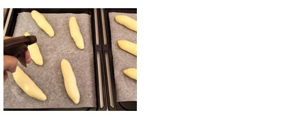收口朝下,排列在已鋪有烘焙紙的烤盤上。