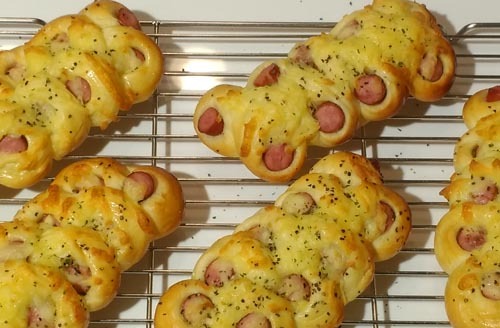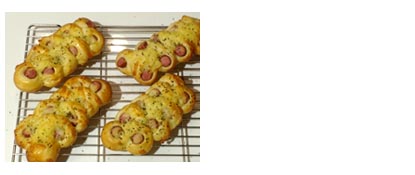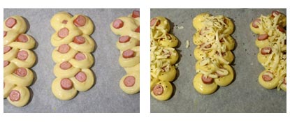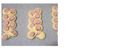 發酵完成後將利用擀麵棍擀開成四方形,將熱狗放置於麵皮上方,由上往下慢慢捲起後,將麵糰轉成直立以剪刀剪出數刀V狀切口。