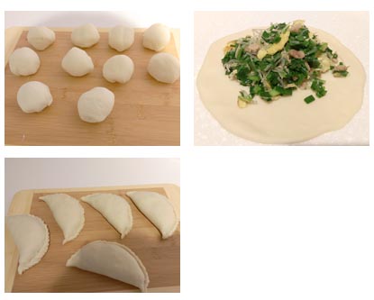 將鬆弛好的麵糰,分成10等份,每個麵團桿成直徑約12公分的圓形,再包入內餡,然後將麵皮對折並捏出花邊。