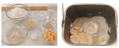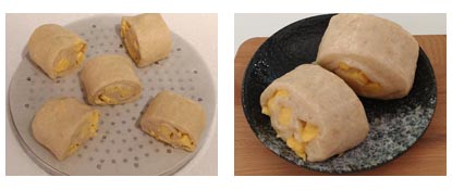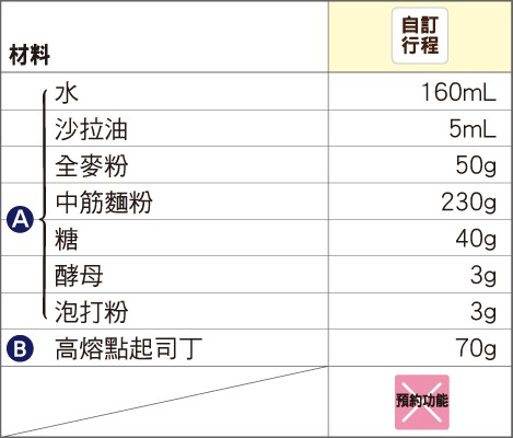 象印食譜»製麵包機食譜»人氣食譜»中式點心»全麥起司丁饅頭 製麵包機食譜 全麥起司丁饅頭 時間設定 揉麵1 醒麵 揉麵2 手工作業 10分鐘 10分鐘 10分鐘 OFF 發酵1 發酵2 發酵3 烘烤 總計 10分鐘 10分鐘 10分鐘 0分鐘 60分鐘 作法 材料A依序倒入麵包容器。 以「自訂行程」鍵進行時間設定,再按下「開始」鍵。 取出完整的麵團,先用擀麵棍擀平。並將餡料B均勻平鋪於糰上。 將麵團搓揉成直徑約2.5公分的長條狀。分割成長約4公分的小饅頭麵團。 請將蒸架上面抹上少許沙拉油 (蒸籠用),將小饅頭麵團放在蒸架上。外鍋加入1/2杯熱水,蓋上蓋子,蒸至開關跳起即可享用。 《 回列表頁 上一道