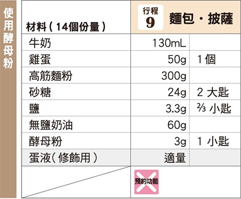 將蛋液( 修飾用) 以外的材料, 依材料表由上而下的順序放入麵 包容器。