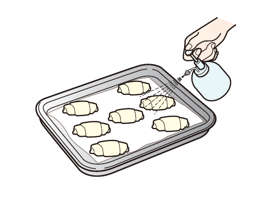 將收口朝下排列在舖有烘培紙的烤盤上,噴灑少許水後,以約35℃發酵30~40分鐘。(發酵至體積膨脹約2倍) -