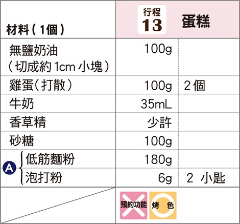 象印食譜»製麵包機食譜»甜點»蛋糕»奶油蛋糕 製麵包機食譜 奶油蛋糕 使用大量奶油製成的重奶油蛋糕。 作法 奶油切成約1cm小塊,回温至常温。 先將 A 混合過篩。 將材料依材料表由上而下的順序放入麵包容器。 以「行程」鍵選擇行程編號「13」, 再按下「開始」鍵。 投料蜂鳴聲(約13分鐘後)響起後, 使用橡皮刮刀等將沾附在麵包容器周 圍的麵粉確實刮落至底部(刮粉), 再度按下「開始」鍵。 ◎進行刮粉可以使烘烤完成的蛋糕側面漂亮。 《 回列表頁 下一道