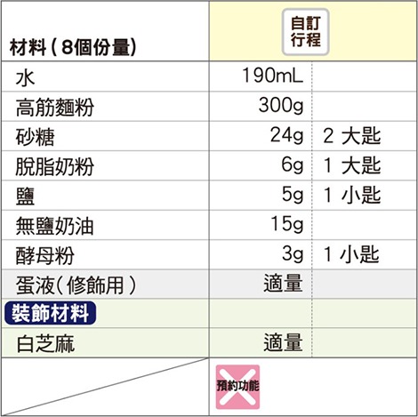 將蛋液(修飾用)和白芝麻以外的材料,依材料表由上而下的順序放入麵包容器。
