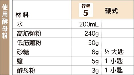 象印食譜»製麵包機食譜»吐司»硬式吐司»硬式吐司 製麵包機食譜 硬式吐司 烘烤成酥脆偏硬的外層。愈嚼愈有深度美味的吐司。 作法 將材料依材料表由上而下的順序放入麵包容器。 以「行程」鍵選擇行程編號「5」,再按下「開 始」鍵。 《 回列表頁 下一道