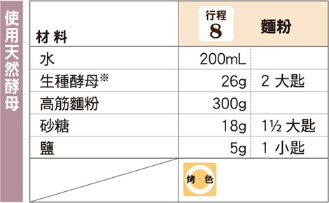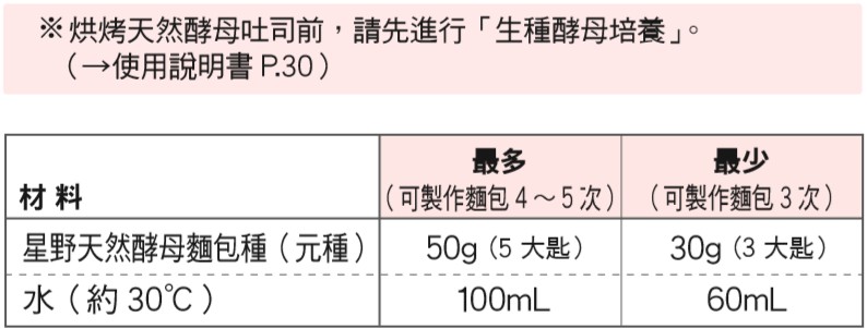 象印食譜»製麵包機食譜»吐司»天然酵母吐司 »天然酵母吐司 製麵包機食譜 天然酵母吐司 品嚐深層風味的天然酵母吐司。 作法 將水放入麵包容器。 放入生種酵母。 ◎請量取均勻混和好的生種酵母。 將1和2以外的材料,依材料表由上而下的順序放入麵包容器。 以「行程」鍵選擇行程編號「8」,再按下「開始」鍵。 《 回列表頁